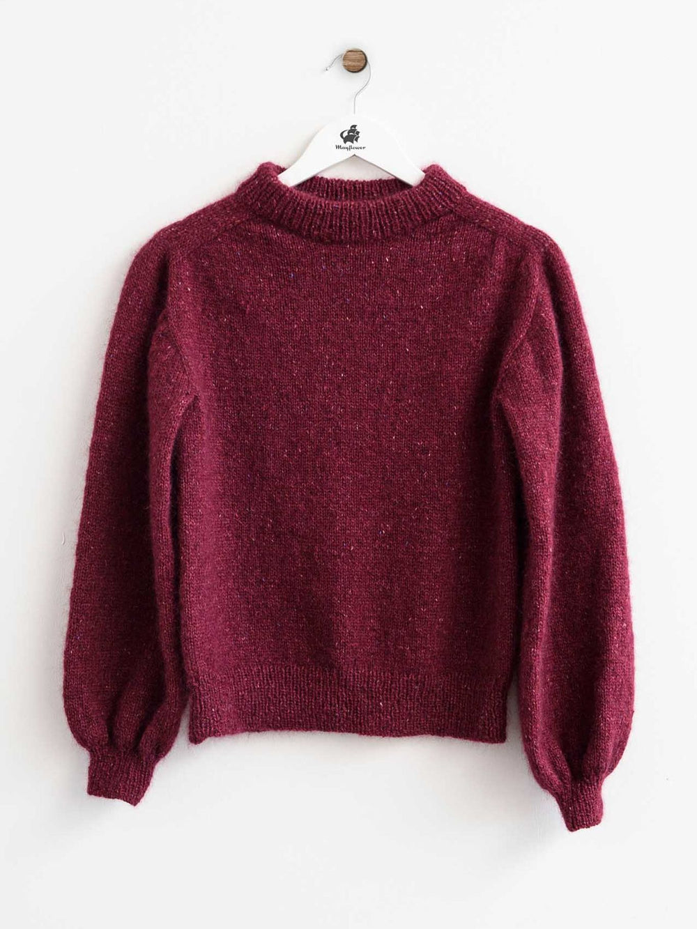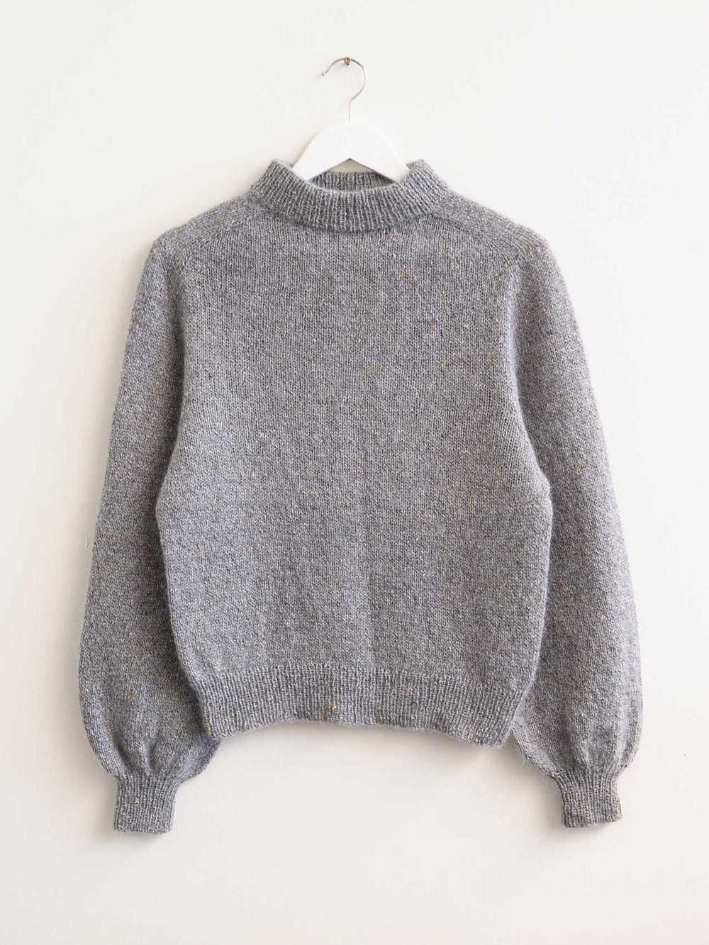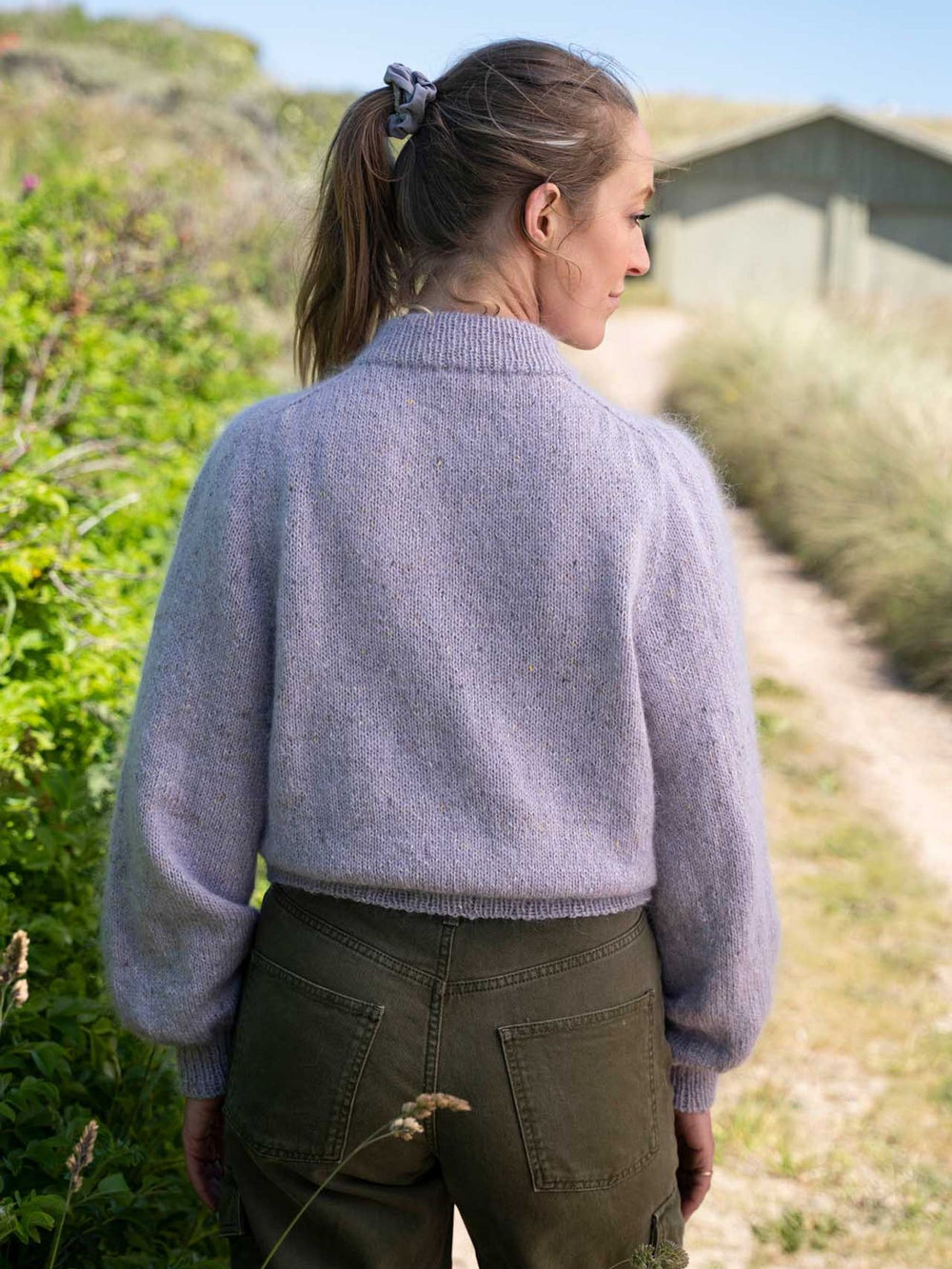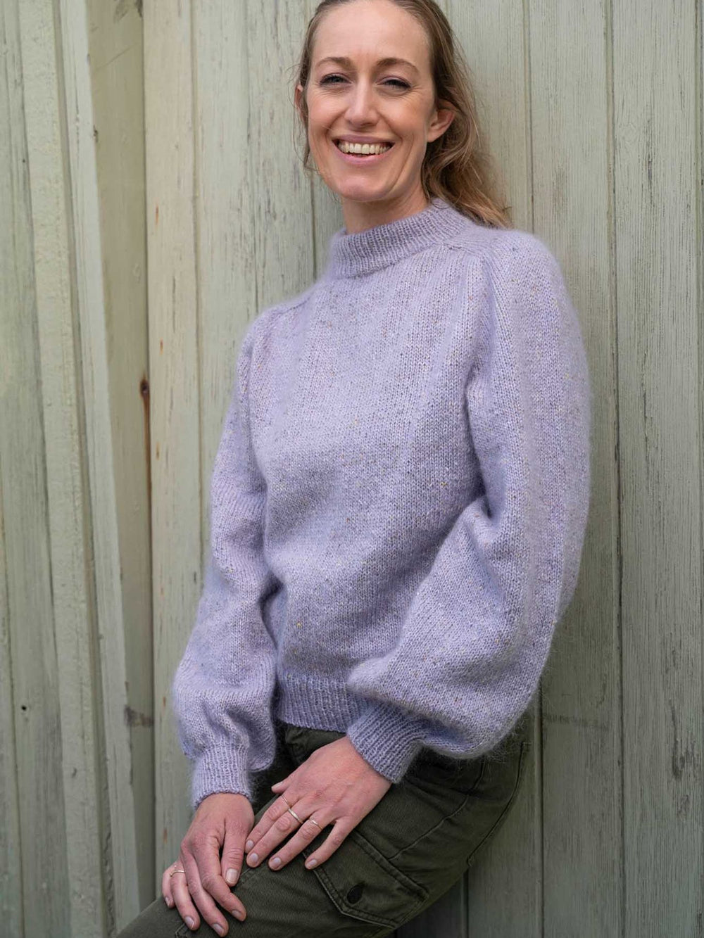 The Nora Sweater is knitted with one strand of Mayflower Birmingham and one strand of Mayflower Super Kid Silk. Our Birmingham has the most beautiful tweed effect, which is slightly muted by a fluffy mohair sheen when knitted together with Super Kid Silk. This gives a beautiful color effect that makes the Nora Sweater extra charming.