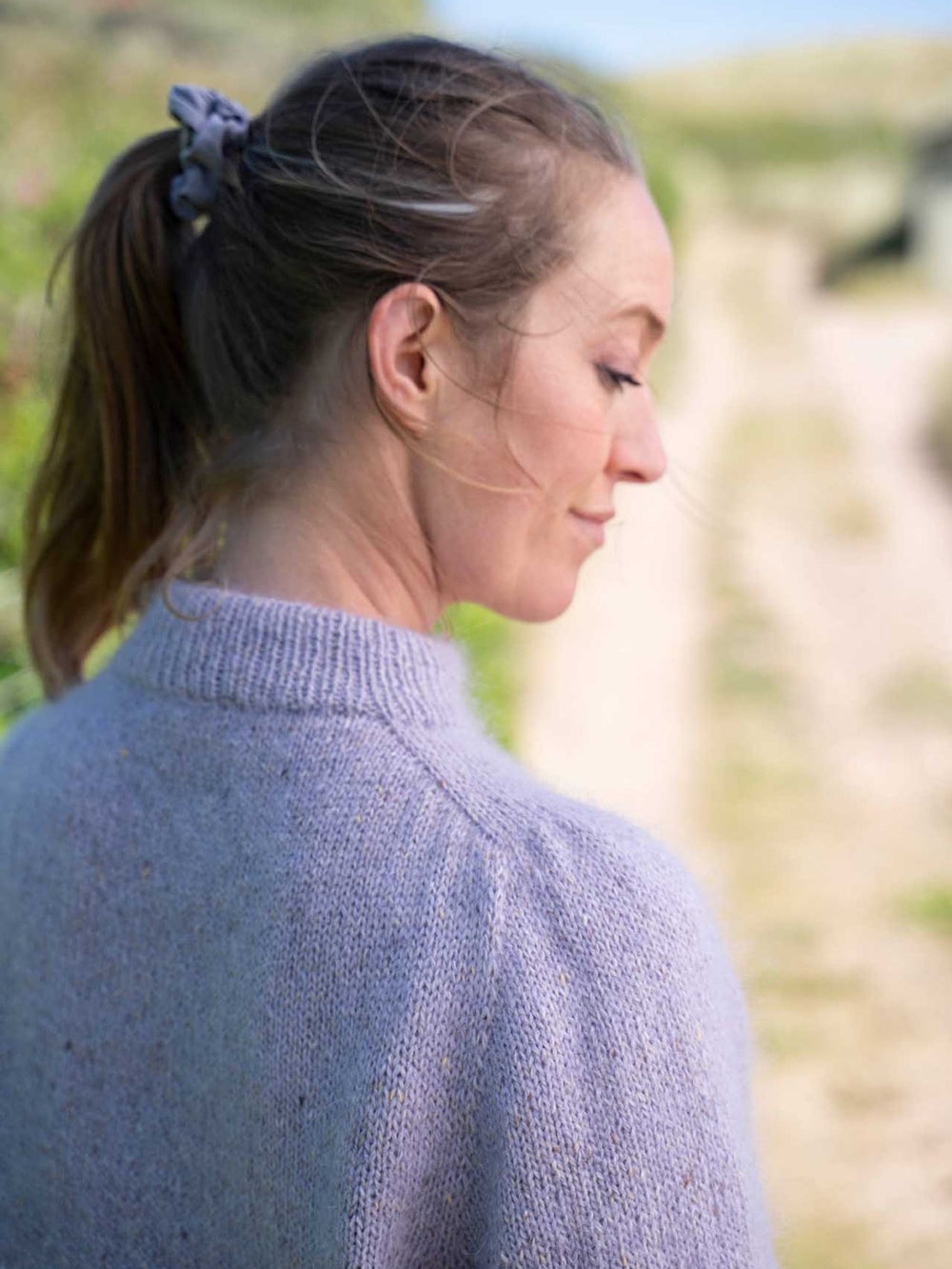 The sweater is knitted from top to bottom in a simple construction that eliminates the need for assembly. To provide optimal fit, it is knitted with saddle shoulders and short rows in the neck. Additionally, a beautiful finish is added with a folded rib edge at the neck and an Italian bind-off.