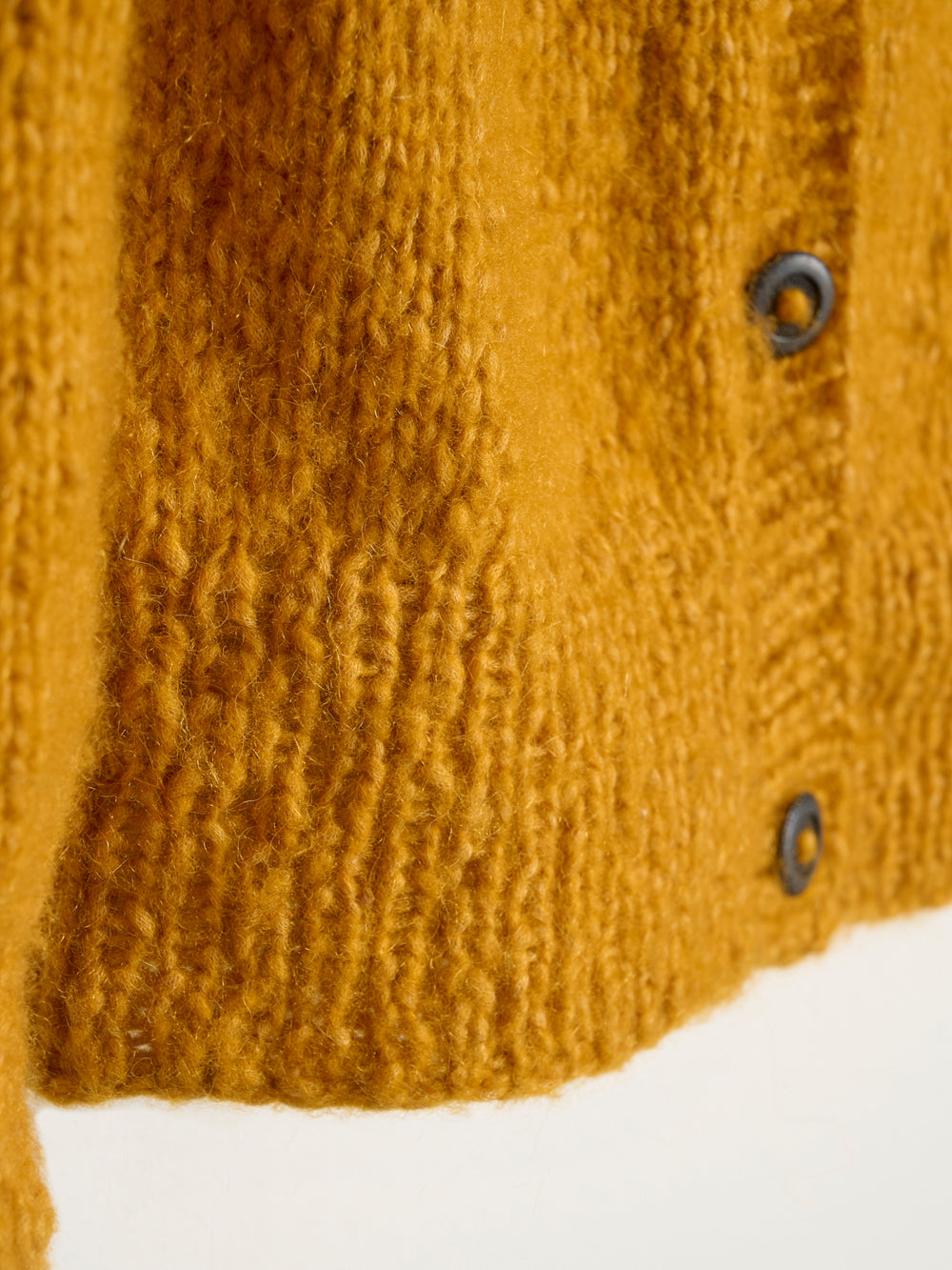 Note: The photos show two different colors of the same sweater. The bottom ribbing on the mustard version is longer than on the gray one.