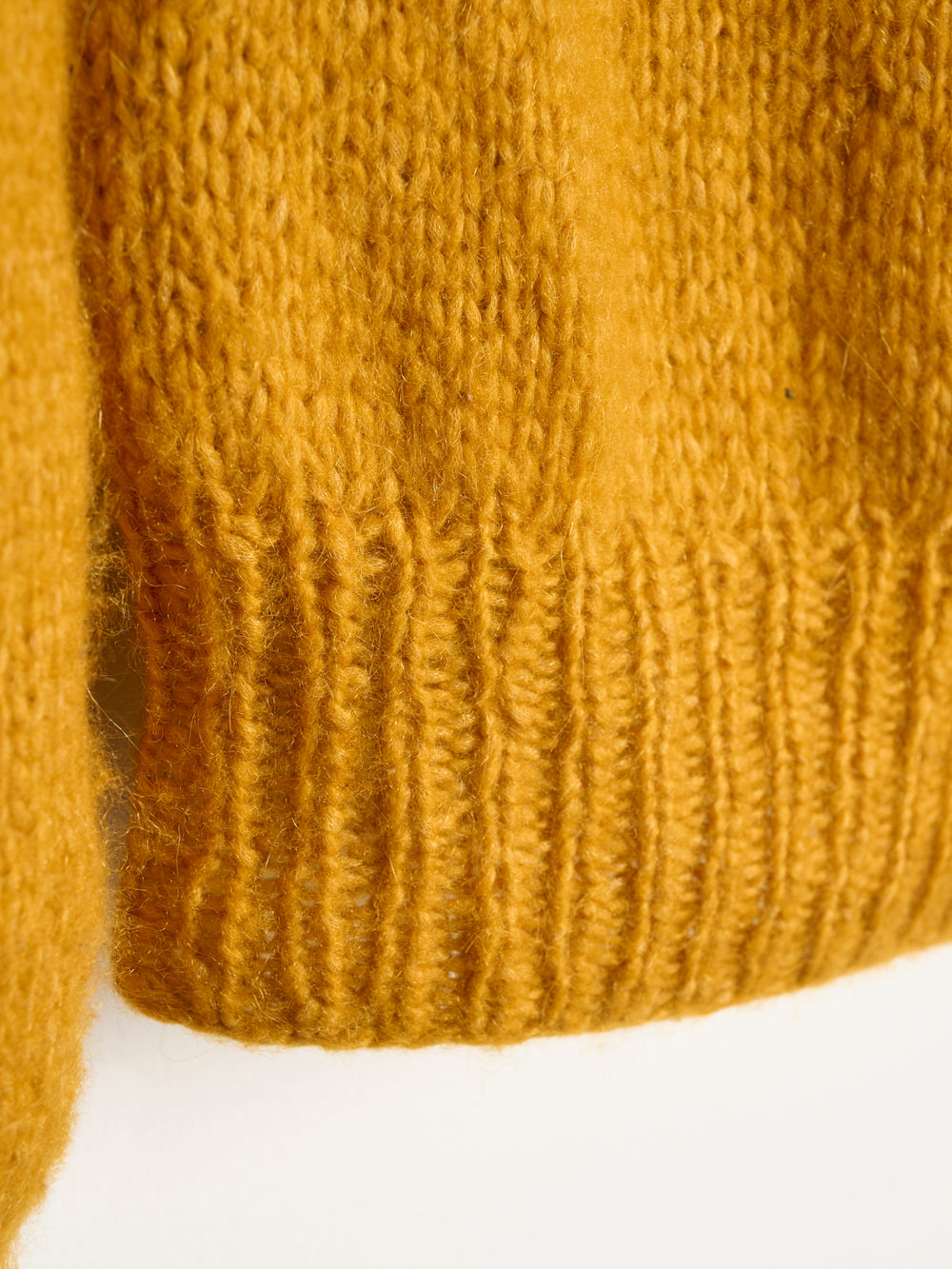 Note: The photos show two different colors of the same sweater. The bottom ribbing on the mustard version is longer than on the gray one.