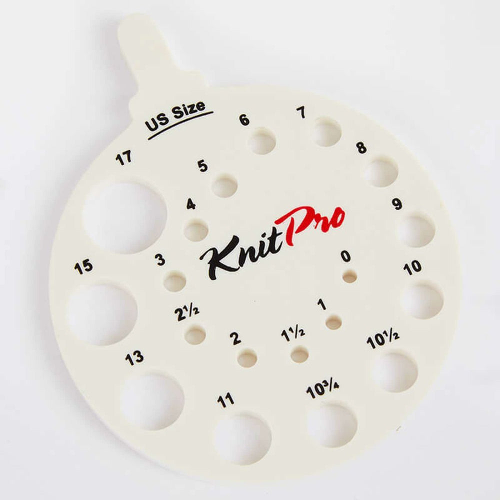 Round knitting needle gauge in plastic from KnitPro, which easily and quickly helps you determine the size of your knitting needle. The knitting needle gauge can measure needles from size 2.0 mm up to 12.0 mm (US 0-17).
