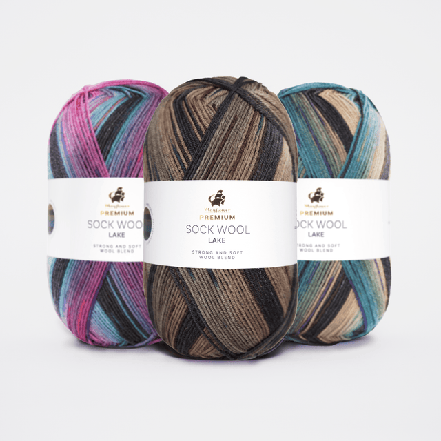 Mayflower Premium Sock Wool Lake is a classic sock yarn of high quality with exceptional, clear colors, stripes, and carefully coordinated color gradation. As the name 'Lake' suggests, the yarn's unique and distinct colors and patterns are inspired by lakes around the world under the sky between fields, trees, and mountains. All the colors in the Lake series have the same color gradation and pattern repeat, which are carefully selected and meticulously coordinated.