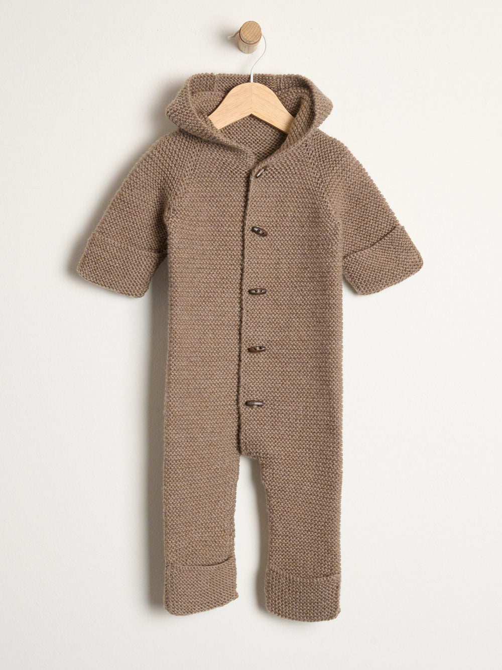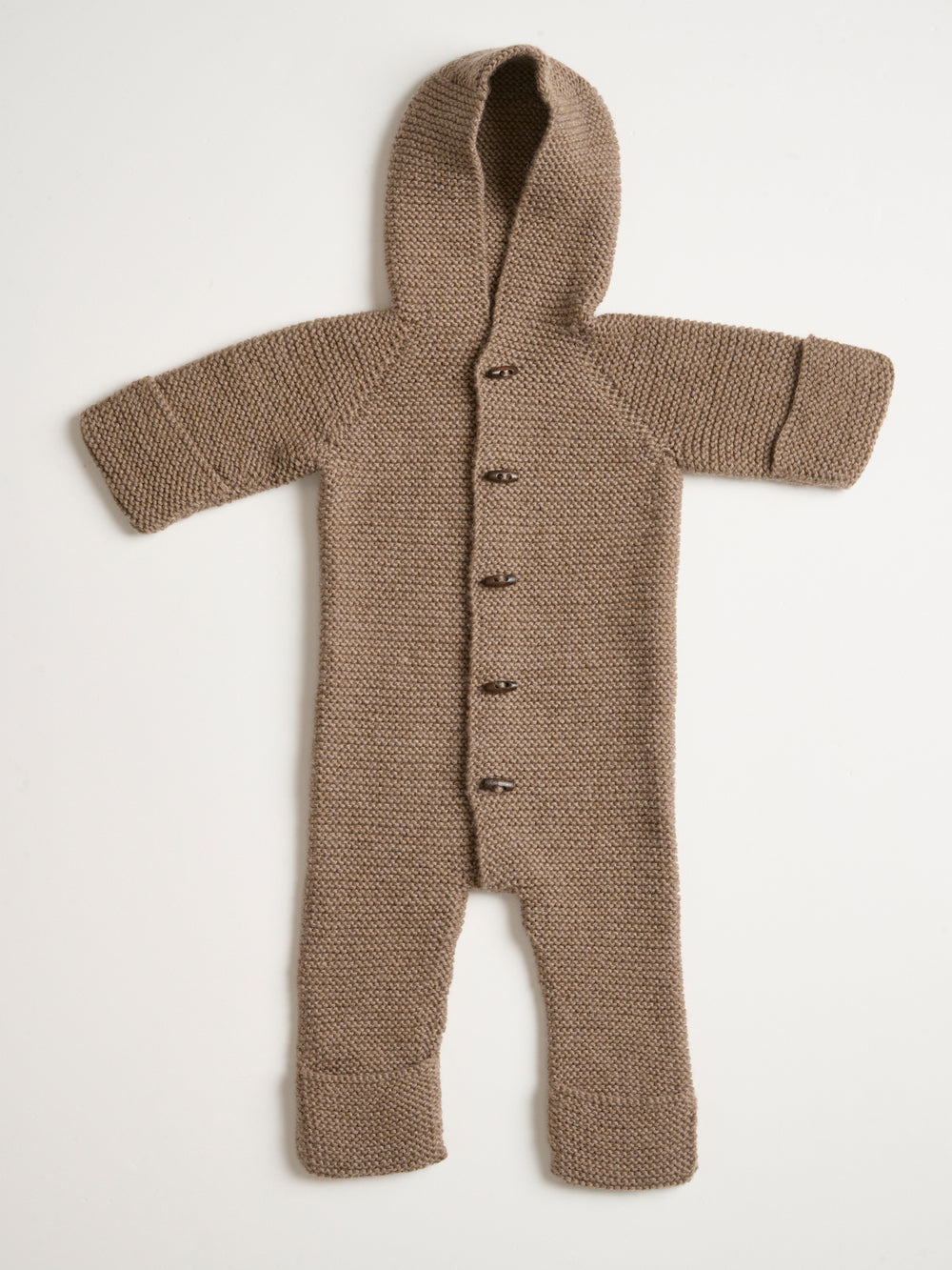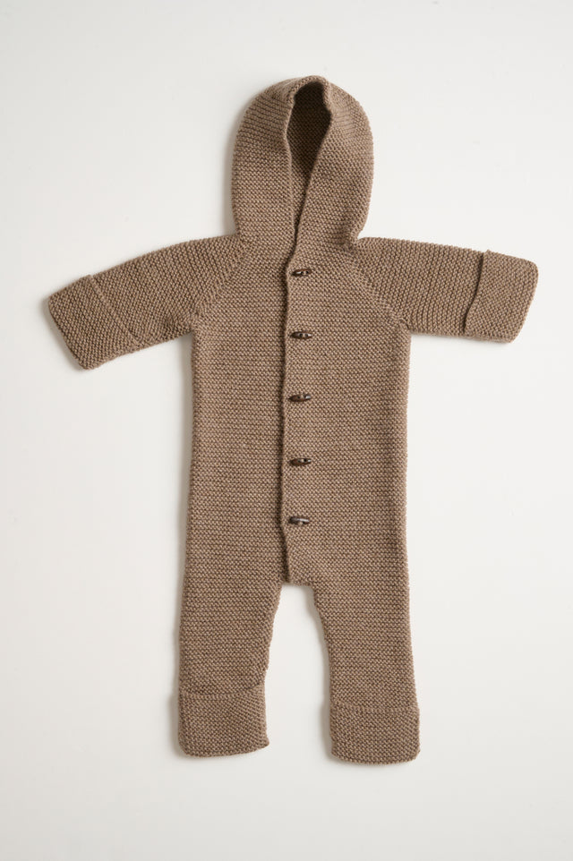 The sleep suit is knitted in Mayflower Easy Care Big, a warm and soft 100% wool yarn. Easy Care Big is easy to care for, as it is machine washable and can be tumble dried.