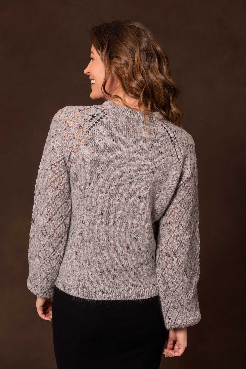 The Skagen sweater is knitted from the top down with raglan increases. Short rows are knitted in the neck to shape the sweater and provide a good fit. However, the sweater's perfect detail is the beautiful sleeves, which are knitted with a lace pattern in harlequin checks.