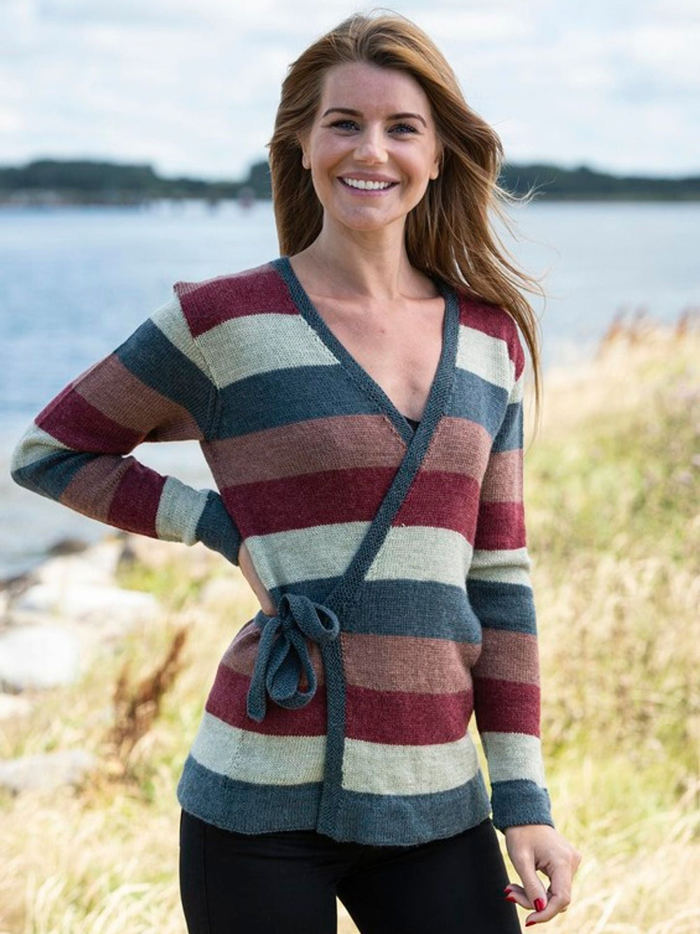 Feminine wrap blouse with wide stripes that give a lively, spirited yet still harmonious expression, as the colors complement each other well. The blouse has a deep V-neckline at the front. The edge of the blouse and the tie are made in pearl knit. The sleeves are attached and end with a smooth fold, just as the blouse is finished with a smooth, folded edge.