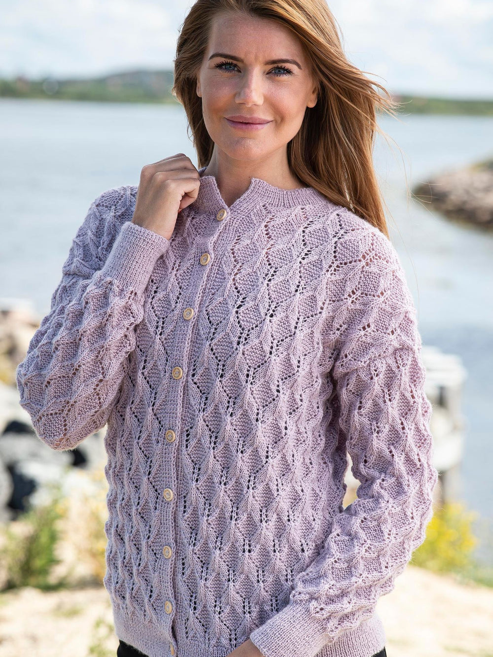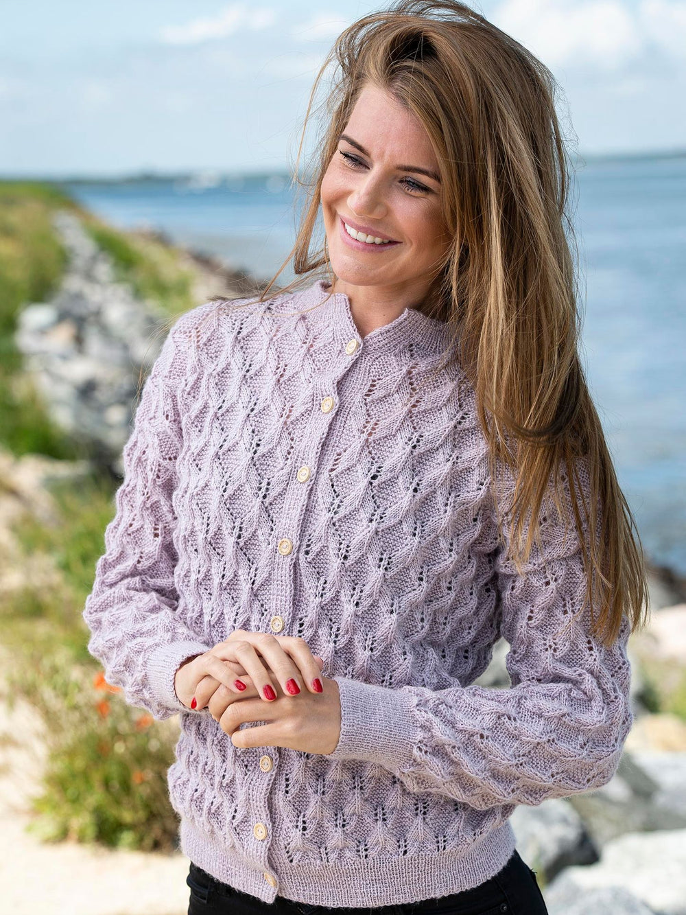 A beautiful and very feminine cardigan with the finest lace pattern on both the body and sleeves. The pattern is delightfully challenging to knit.