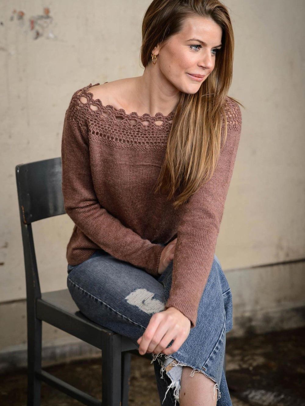 The crocheted yoke is the blouse's primary detail, and the yoke is particularly beautiful with its lace appearance, making the blouse more summery. For the same reason, the rest of the blouse is made in garter stitch, so the yoke is further highlighted.