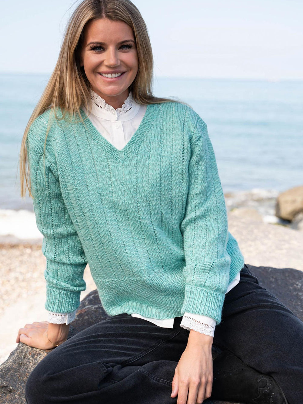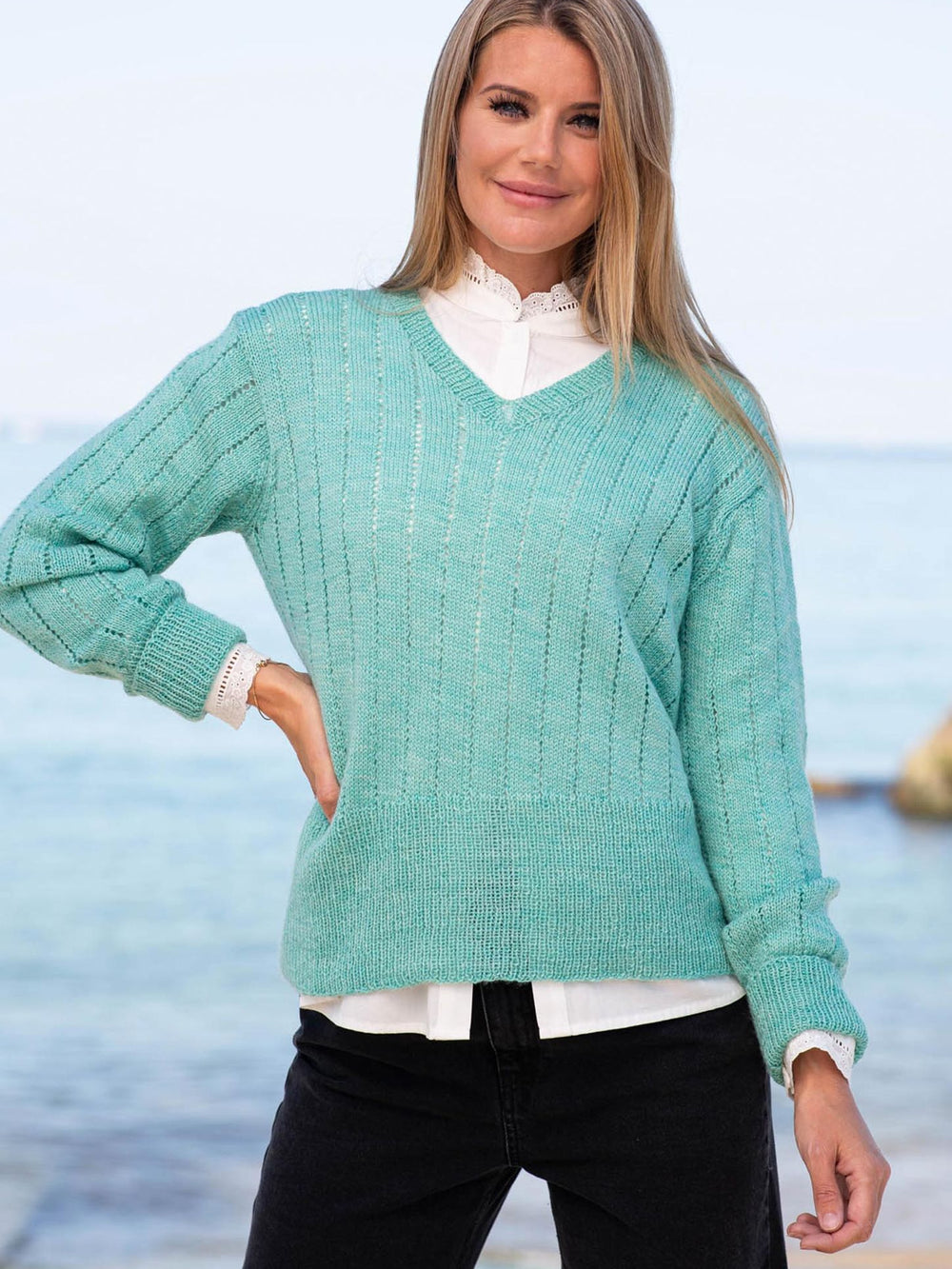 A classic V-neck sweater is always nice, and it becomes even more beautiful with a lace pattern. This sweater is designed with lovely vertical lace rows. The lace rows add a textured pattern to the blouse and at the same time create some beautiful vertical stripes.