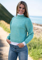 The sweater's rib details continue in the neckline as well as at the bottom of the sleeves and the sweater's body, which contributes to a cohesive and stylish look. This look is a reinterpretation of a classic turtleneck sweater.