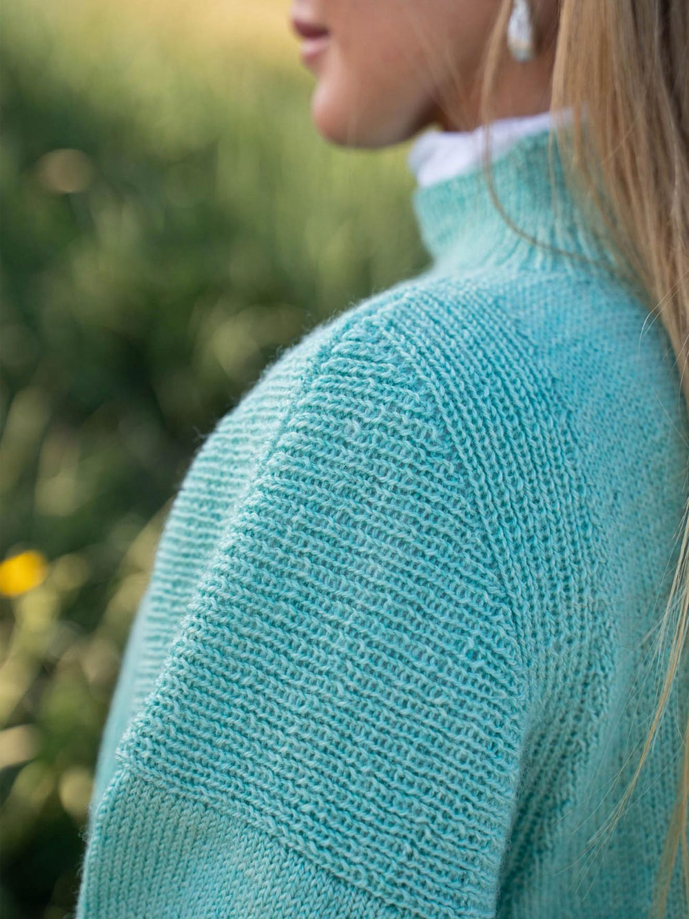 The pattern is easy to follow, as the front piece, back piece, and sleeves are knitted separately and then sewn together.