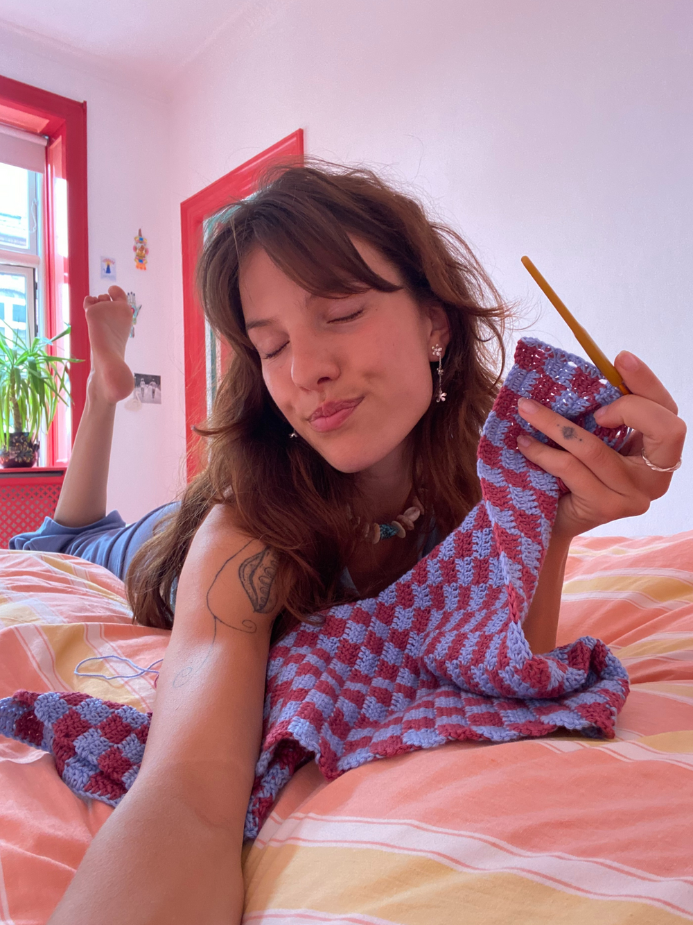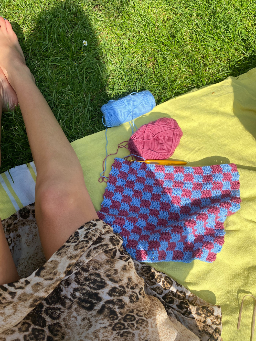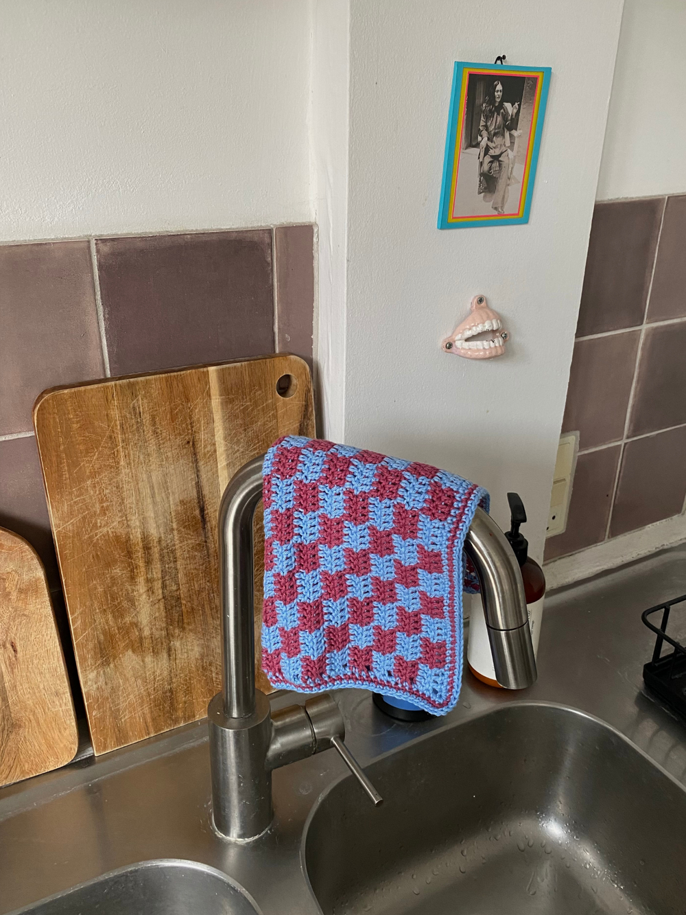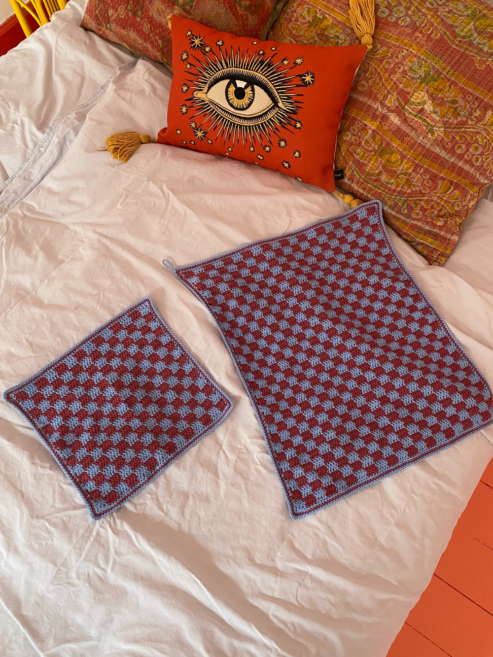 Crochet a set for the kitchen consisting of a dishcloth and a tea towel, both in a checkered design.