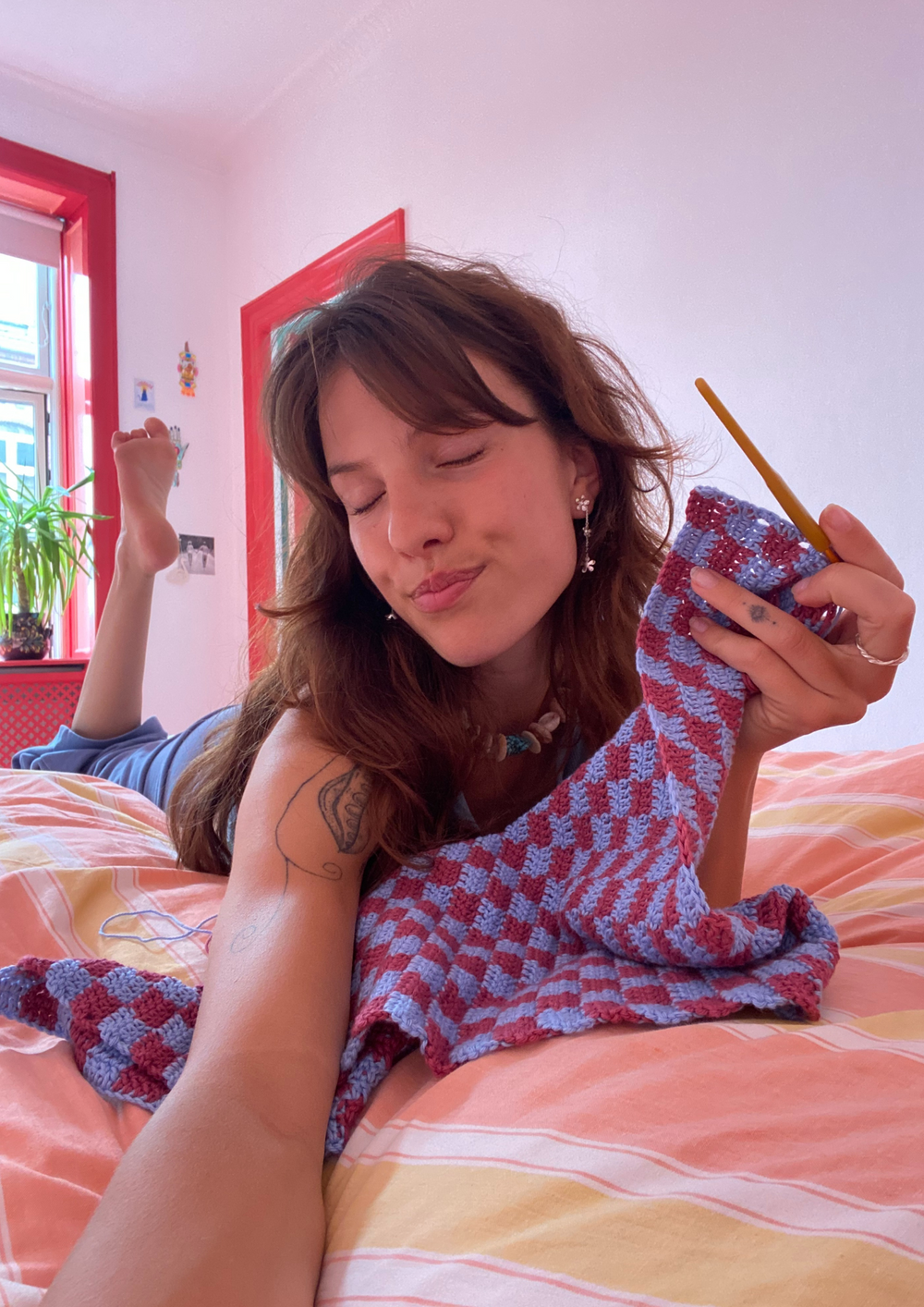 Crochet a set for the kitchen consisting of a dishcloth and a tea towel, both in a checkered design.