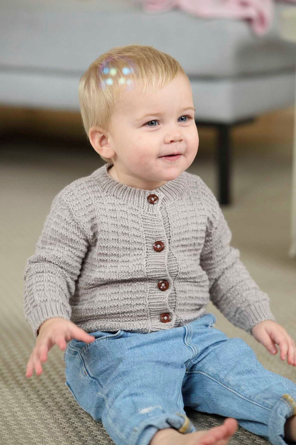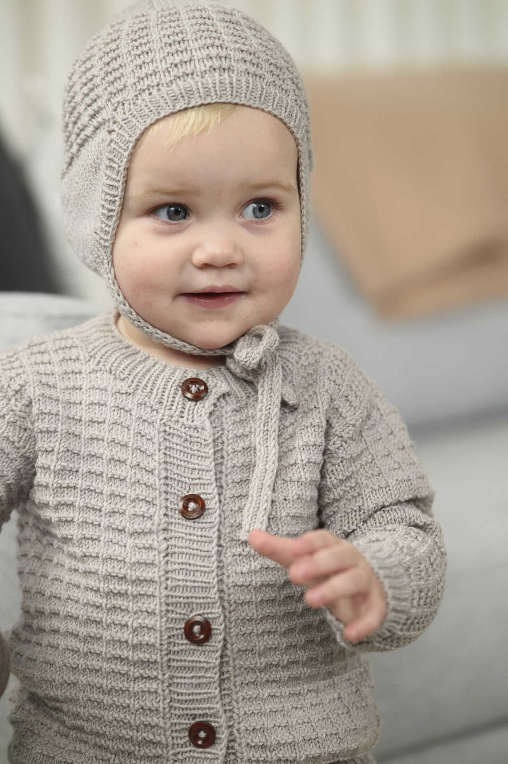 The cardigan becomes really soft and lovely as it is knitted in Mayflower London Merino Fine, which is a wonderful wool yarn spun from extra fine merino wool. The cardigan is therefore incredibly comfortable and feels lovely against the delicate and fine baby skin. The wool is breathable and warm, so the child can wear the cardigan most of the year.